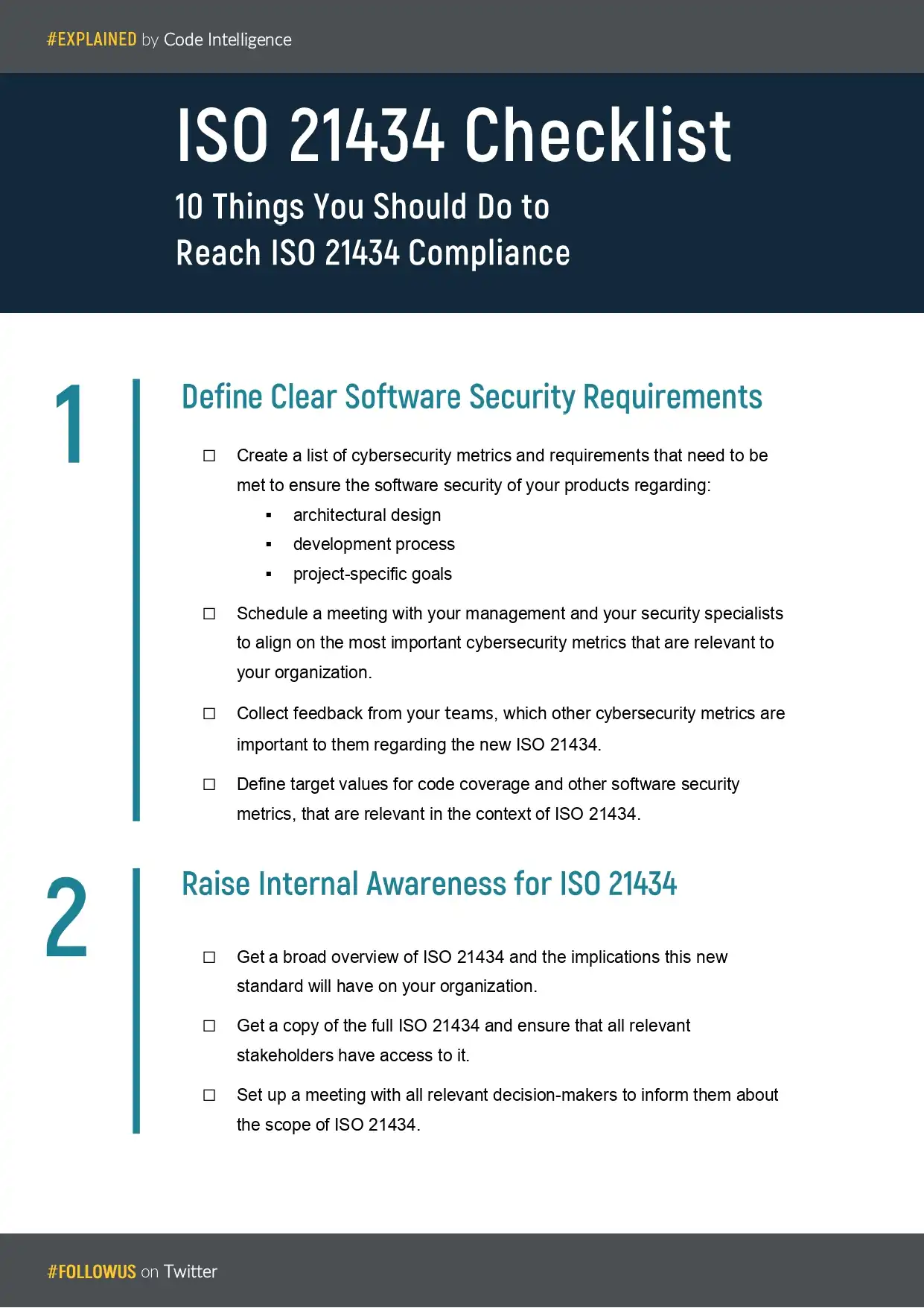 This checklists provides action steps that will help you reach ISO 21434 compliance
